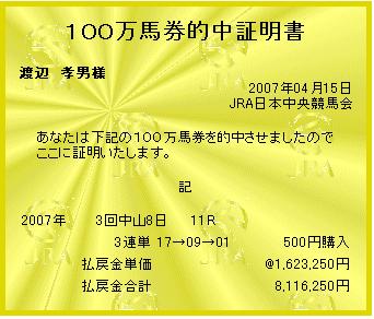 宣言通り松岡サンツェッペリンが押してハナに立とうとするが意外とズブい。内フェラーリピサ、外メイショウレガーロの間を押して押して、やっと1コーナーで先頭に。しかし息つく暇なく勝春ヴィクトリー。2コーナー手前で交わされ2番手。一瞬マズいと思ったが、松岡はこういう展開も想定していた由。「馬任せ」で行かせた勝春の判断も良かったが、競り合わず2番手でピタリ折り合わせた松岡のフレキシブルな騎乗は賞賛に値する。私の予想と逆の並びにはなったが、逃げたヴィクトリーの千通過は59.4の平均ペース。2馬身後方にサンツェッペリン、さらに5〜6馬身後方に福永メイショウレガーロ、幸四郎アサクサキングス。この3.4番手の2頭(というか2人)が抑え過ぎたがため、前の◎○2頭は楽。このペースで縦長の展開は異常だ。さらに人気を分けた2強=武アドマイヤオーラ、安勝フサイチホウオーが申し合わせたように後方追走。お互いを意識したのか、前の2頭を見縊ったのか。如何な名手でもペース判断を誤ることはある。3角でサンツェッペリンが仕掛け4角でヴィクトリーに襲い掛かる。激しい直線の攻防に突入。坂上まで◎○2頭のマッチレース。サンツェッペリンが差し切る勢いで迫るが内のヴィクトリー。抜かせない。手前を替えたか渋太く差し返す。そして大外から▲安勝。内に切れ込み気味にフサイチホウオーの豪脚。次元の違う脚色でグイグイ追込み3頭鼻ヅラを合わせたところがゴール。所謂クビの上げ下げ。願わくば◎に勝って欲しかったところだが致し方なし。確かに一旦は先頭に躍り出たサンツェッペリン。後検量でヘルメットを叩きつけ悔しがった松岡。しかし単勝15人気、100.6倍の馬。大健闘だろう。・・・4年前。サクラプレジデントでアタマ差2着に敗れた皐月賞。まさに泣きっ面に蜂、勝ったネオユニヴァースのデムーロにゴール後頭を叩かれた屈辱は忘れ得ぬだろう田中勝。15年ぶりGIのお立ち台だ。「岩田君のようにはやっぱ乗れませんでした(笑)」皐月空にカッチースマイルが弾けた。会員の皆様、第67回皐月賞、馬単17万8340円○◎、3連単162万3250円○◎▲超確勝大的中!本当におめでとうございました!!