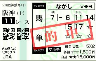 | ◎ | △ | △ | … | ▲ | 82 | 6 | 11 | グランプリボス | 牡3 | 56 | 岩田康誠 | 差し | 勇躍始動 |