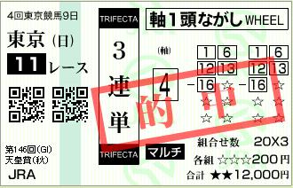 | ◎ | ▲ | ▲ | ▲ | ◎ | 82 | 2 | 4 | フェノーメノ | 牡3 | 56 | 蛯名正義 | 先行 | 皇位簒奪 |